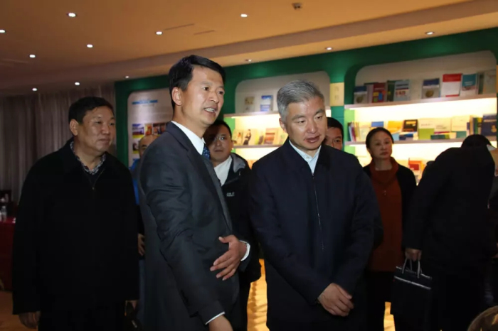 西藏阜康醫(yī)療股份有限公司黨委書記、董事長王斌向莊嚴(yán)書記介紹"阜康企業(yè)文化”