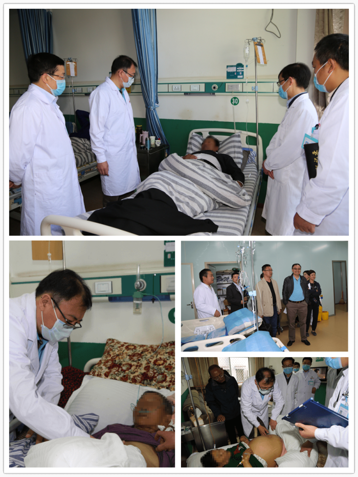 在阜康醫(yī)院住院部,周平紅教授一行換上工作服和阜康醫(yī)院消化內(nèi)科醫(yī)護(hù)人員一起查房。在44號尼珍的病床前,周平紅教授詳細(xì)詢問病人的生理、病理指標(biāo),阜康醫(yī)院醫(yī)護(hù)人員一一詳細(xì)回答。之后,周平紅教授走到病床前對患者的體征狀況進(jìn)行了仔細(xì)檢查,并向家屬詢問病人的實(shí)時(shí)病況。周平紅教授還來到89歲的患者扎西、離退休人員格桑的病床前,詢問了病人的各項(xiàng)指標(biāo)并仔細(xì)進(jìn)行了體征檢查。