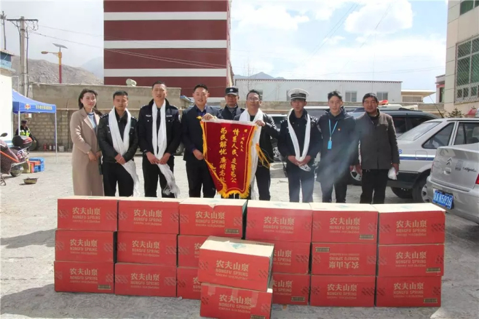 為拉薩市公安局交通警察支隊(duì)城北大隊(duì)送去錦旗和20箱礦泉水